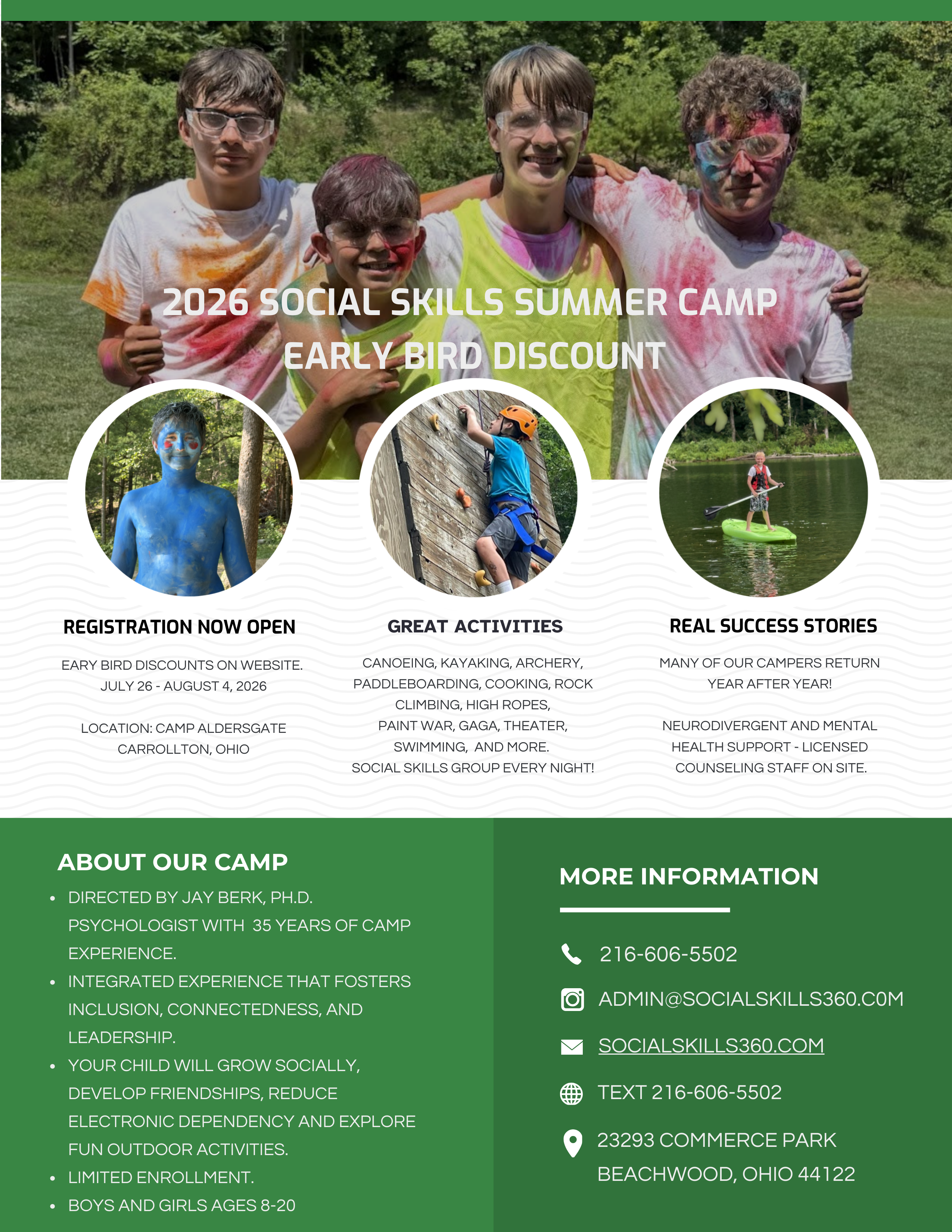Campers will participate in activities such as fishing, swimming, hiking, gaga, archery, paint war, sports court, goldrush, nine square, canoeing, stand-up paddle boards, slip-n-slide, kickball, water games, slime dunk tank, rock climbing, high ropes and much more. Plus social skills group every night!
