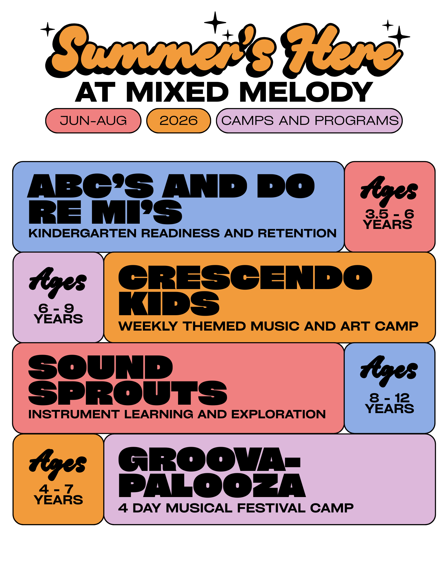 Get ready to turn up the volume and dive into the ultimate kid-friendly music festival experience! At Groovapalooza campers will explore a brand-new genre each day — complete with featured music from our “headliner,” hands-on music-making, high-energy dance parties, and creative crafts to match the vibe. Each day is designed to spark confidence, creativity, and pure joy through music.