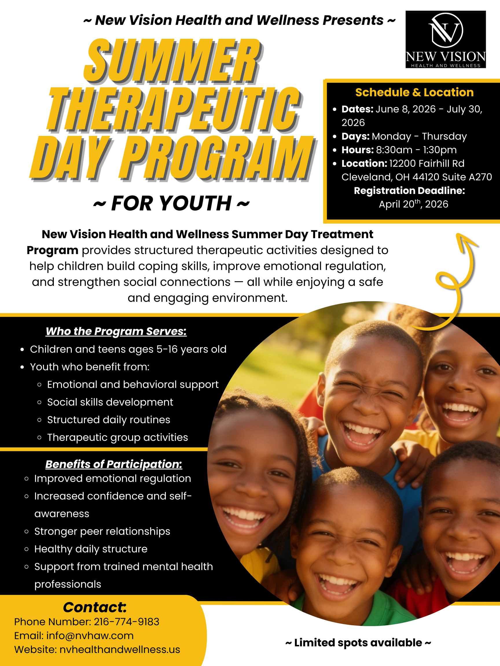 New Vision Health and Wellness Summer Day treatment Program provides structured therapeutic activities designed to help children build coping skills, improve emotional regulation and strengthen social connections – all while enjoying a safe and engaging environment.